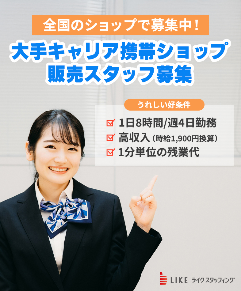 大手キャリアの携帯ショップでの案内、ご提案。 契約作業などはなく、販売専念のスタッフとなります。